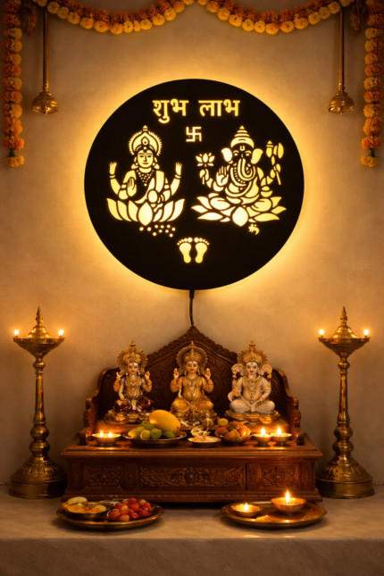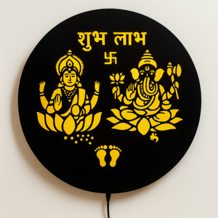 Shubh Labh Lakshmi Ganesh Wooden LED Wall Light – 12×12 & 18×18 Inch (Warm Light)