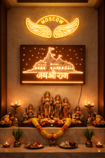 Ram Mandir LED Wall Light – 12×18 Inch Imported MDF Velvet Print with Gold Leaf & Warm LED Backlight | Spiritual Home Décor