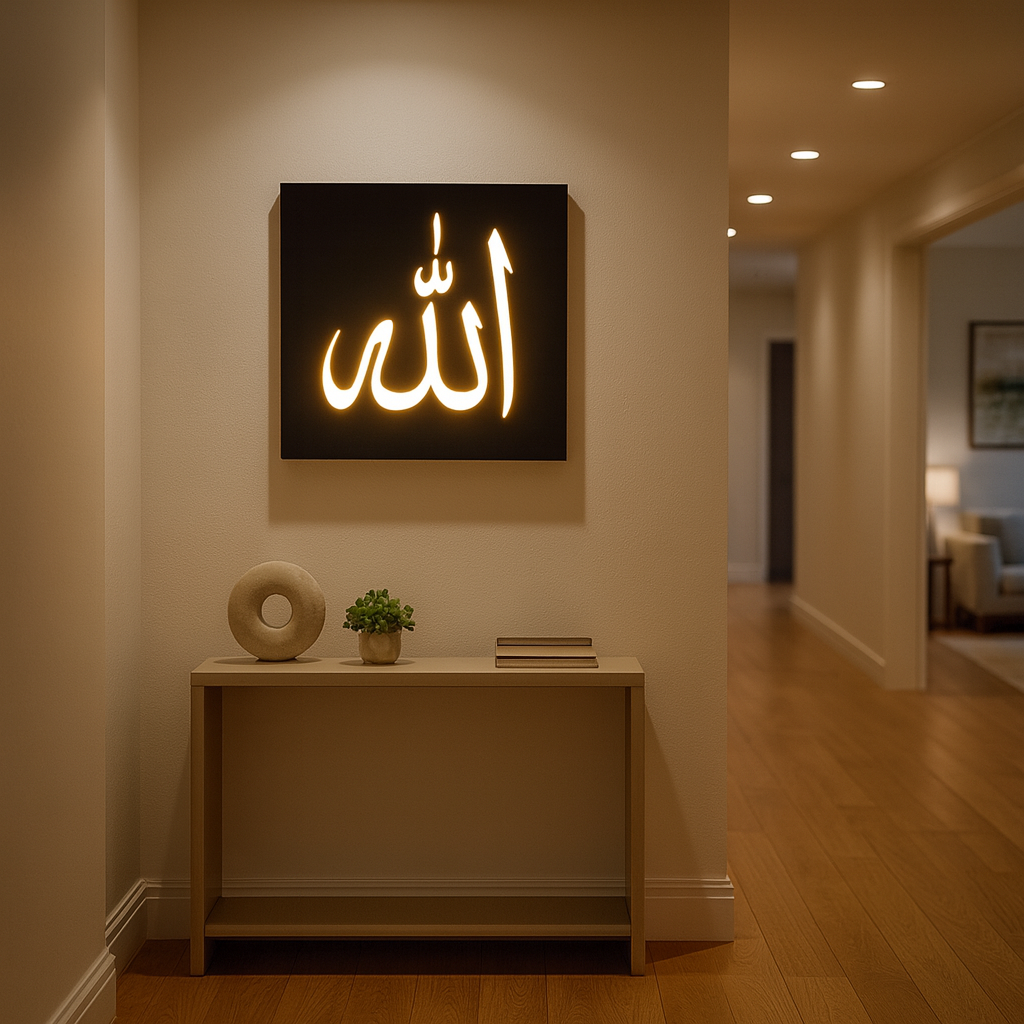 Bring peace and elegance to your space with this 12×12 inch MDF wooden LED wall light featuring the sacred “Allah” calligraphy. Crafted from premium MDF wood and illuminated with a warm LED glow, this wall light creates a calm and spiritual atmosphere. Its minimalist design blends beautifully with modern and traditional interiors, making it ideal for prayer rooms, living areas, and Islamic home décor.