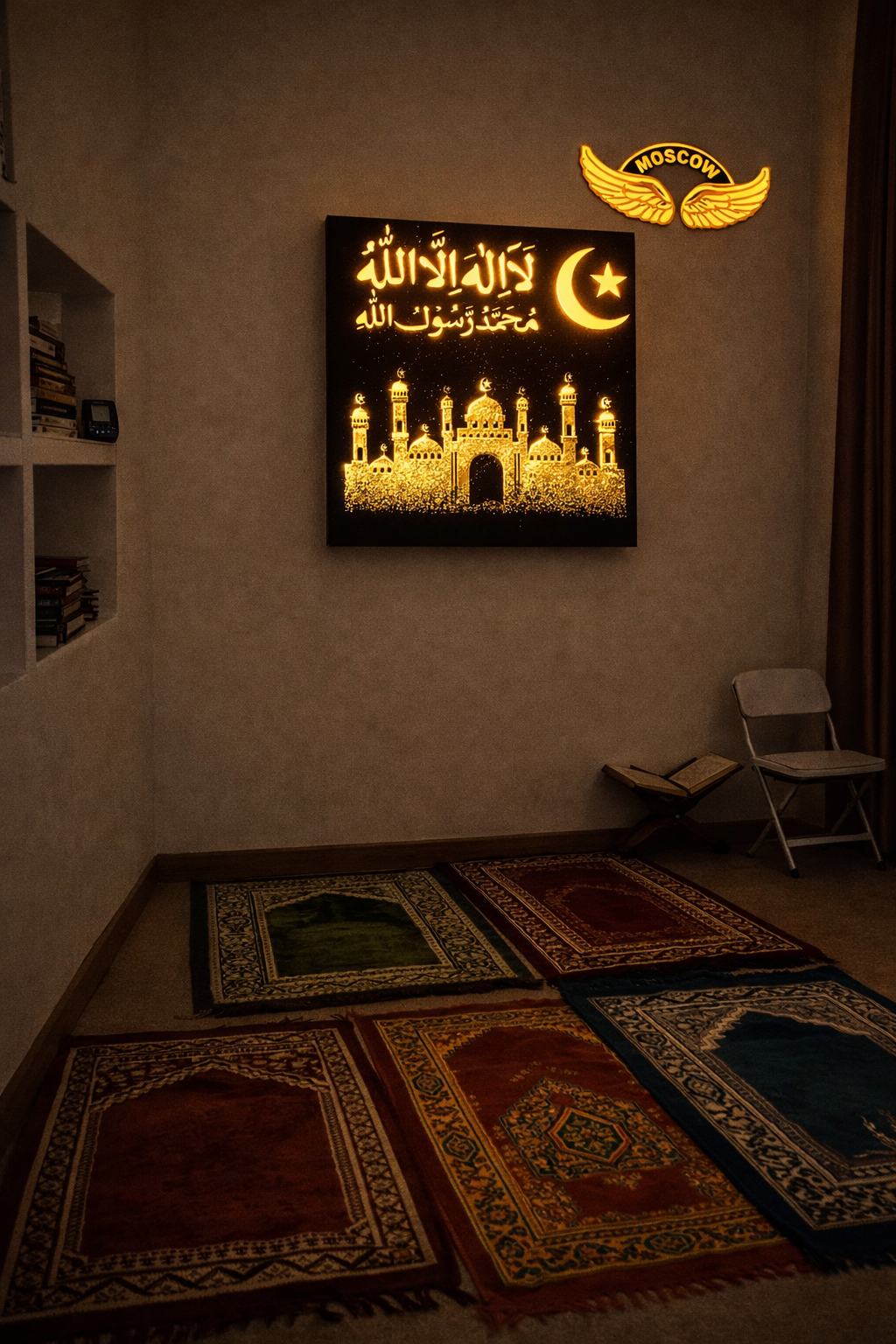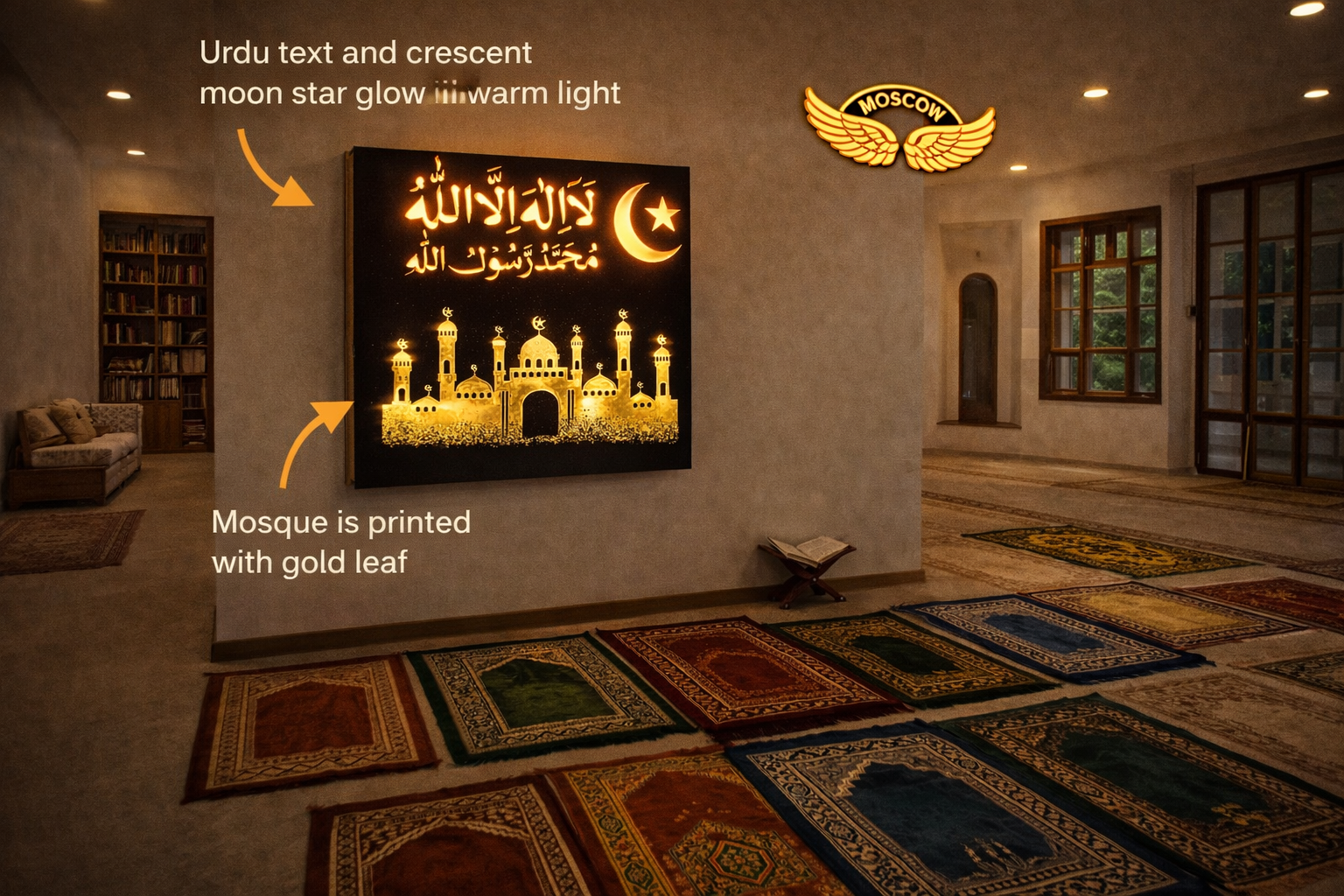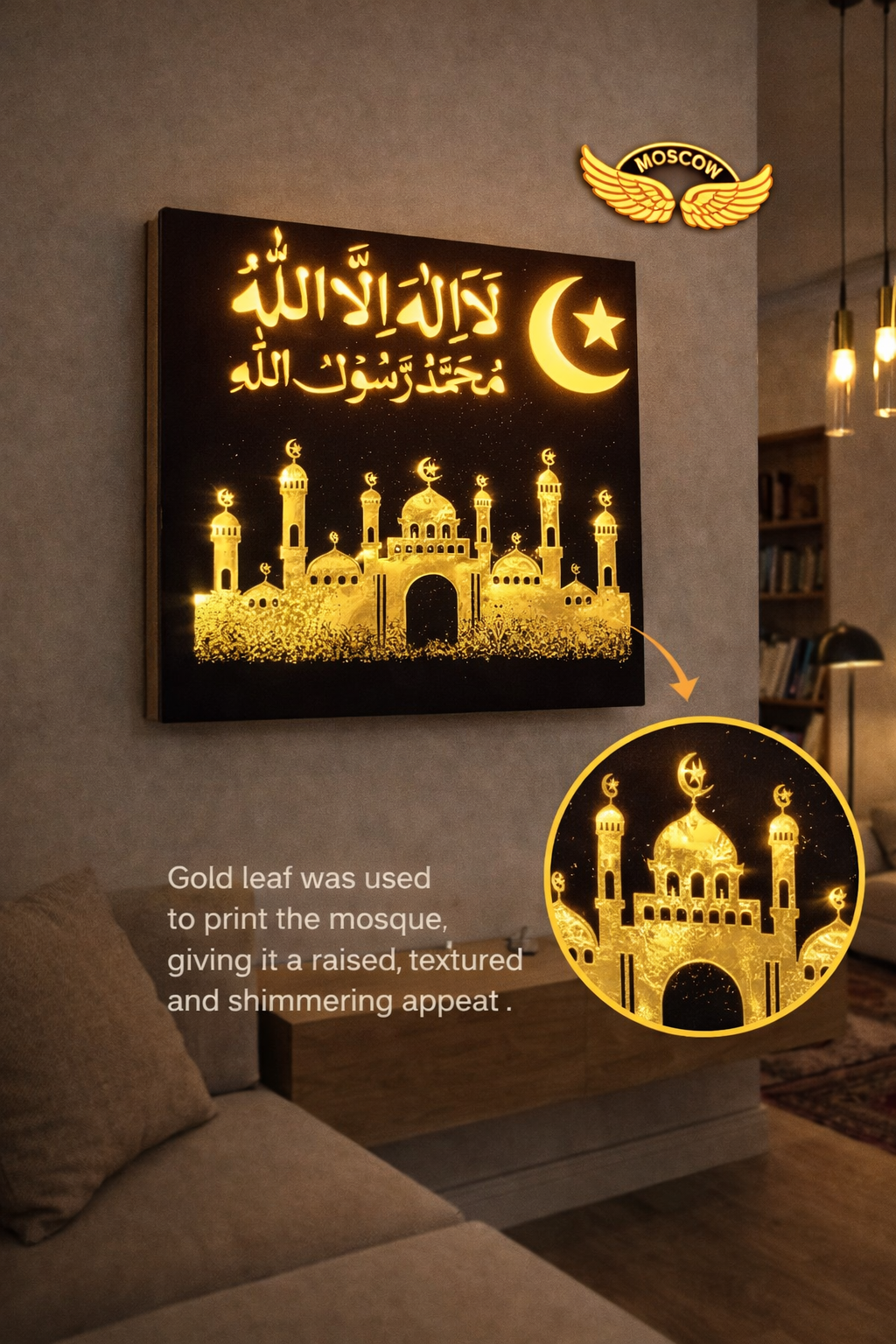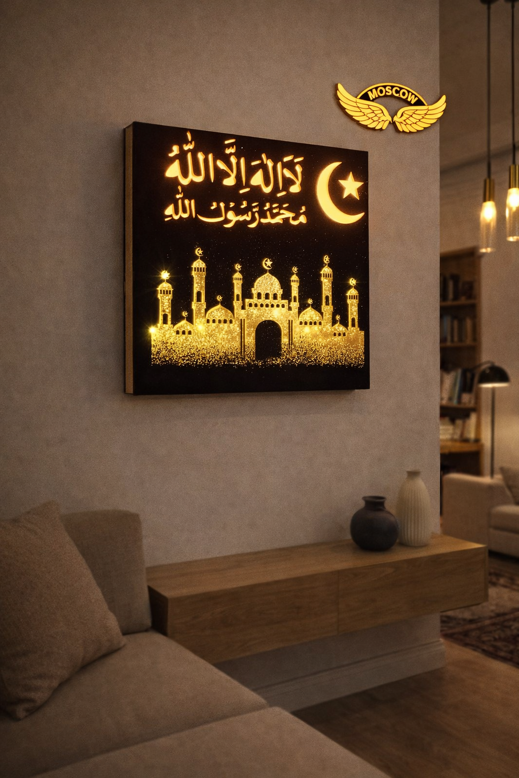 Bring divine beauty and spiritual elegance to your space with the Moscow Wings – Jerusalem Mosque LED Wall Décor. This premium wall art showcases sacred Urdu text, a glowing crescent moon and star, and a beautifully detailed Jerusalem Mosque design printed using luxurious velvet finish with gold leaf work.