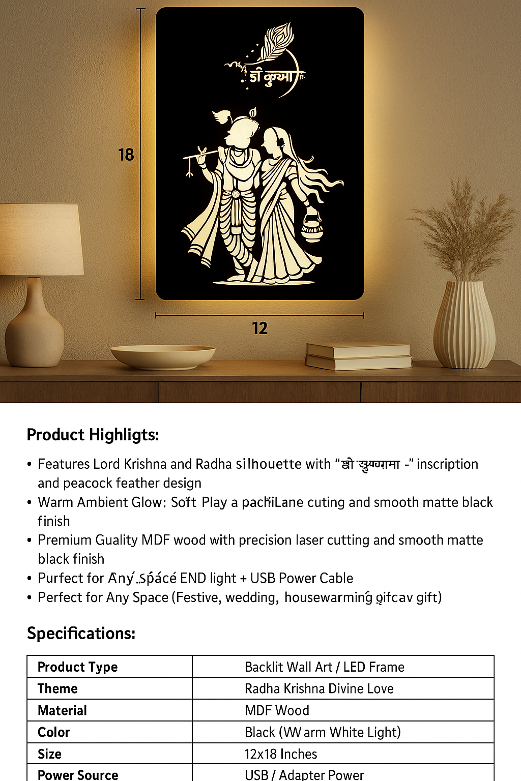 Bring divine love and serenity into your home with this beautifully crafted Radha Krishna MDF Wooden LED Wall Light. Designed in a graceful standing pose, this wall light features an elegant Radha-Krishna artwork illuminated with a soothing warm LED glow. Made from high-quality MDF wood, the precision cut design creates a soft backlit effect that enhances both spiritual and modern interiors.