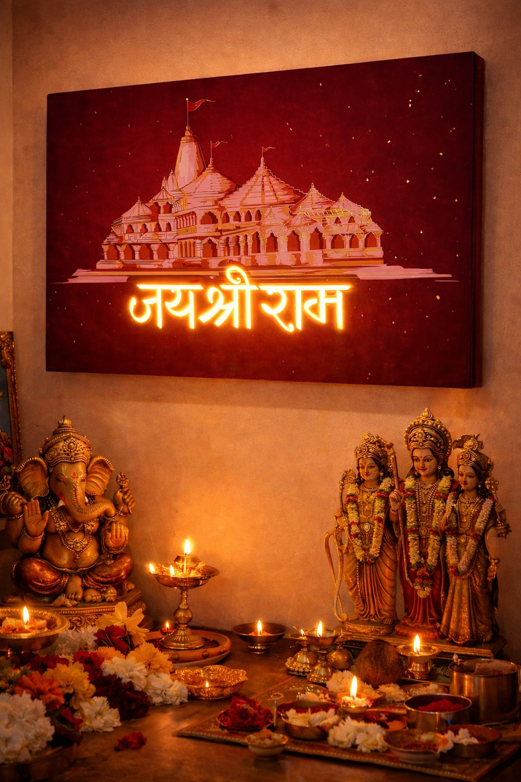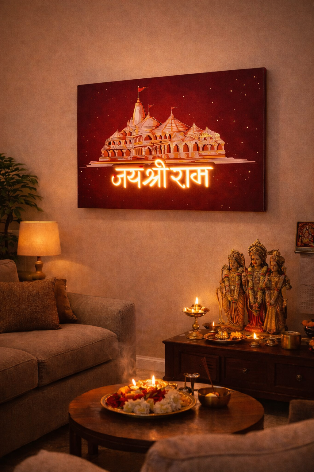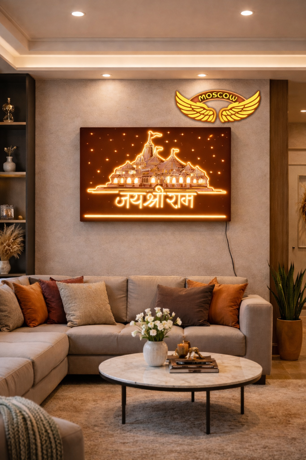 Home Wall Hangings & Decor Wooden-Acrylic-Backlit Ram Mandir LED Wall Light – 12×18 Inch Imported MDF Velvet Print with Gold Leaf & Warm LED Backlight | Spiritual Home Décor