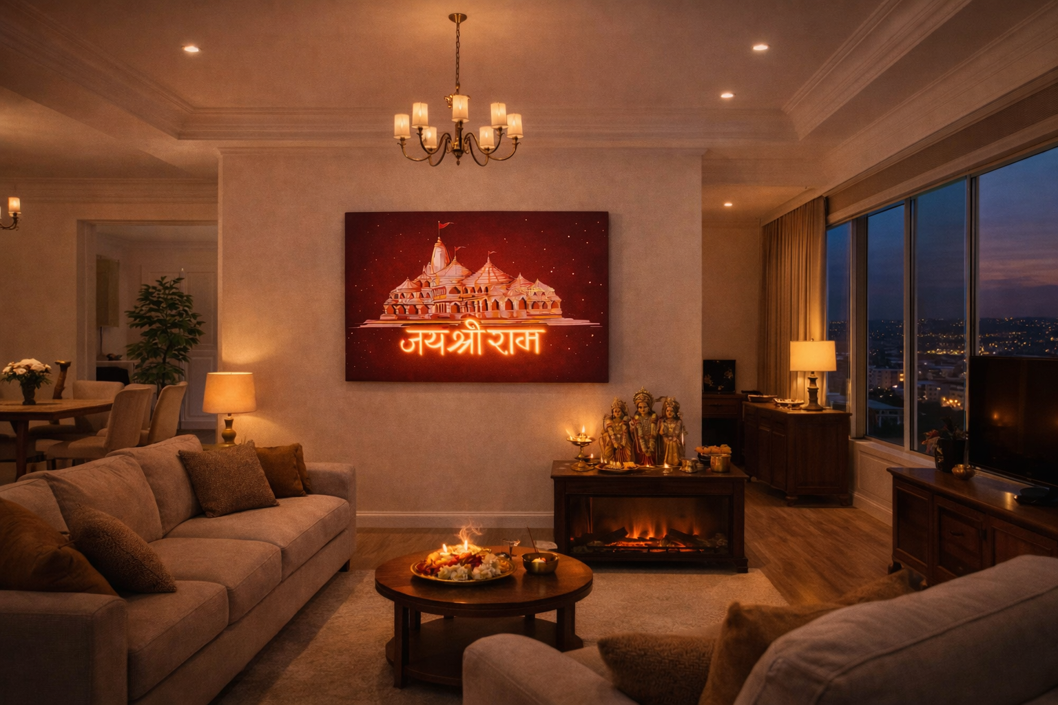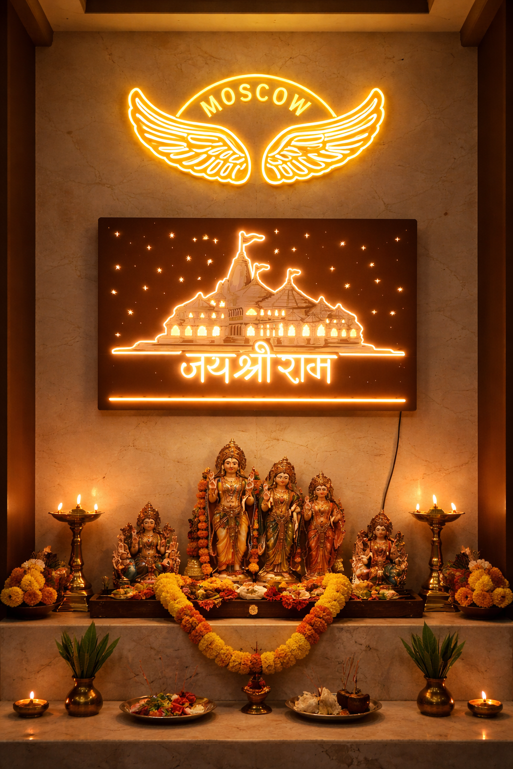 Bring divine elegance to your space with this 12×18 inch Ram Mandir LED Wall Light, crafted from imported MDF wood, premium velvet print sheet, and gold leaf detailing, enhanced with acrylic-backed warm LED lighting. A perfect blend of devotion, luxury, and modern décor.